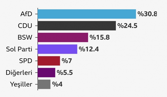 Almanya'da ilk kez seçim yarışına katılan ve kendisini "sol muhafazakar" olarak nitelendiren Sahra Wagenknecht İttifakı (BSW) ise iki eyalette de üçüncü sırada yer aldı.