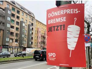 Şehrin birçok yeri partilerin ve adayların seçim afişleriyle dolup taşmış durumda. Ancak en dikkat çeken reklam kampanyası ise iktidar partisi Sosyal Demokrat Parti (SPD) Kreuzberg teşkilâtının dönerli afişleri oldu. Artan döner fiyatlarına gönderme yapılan afişte Dönerde fiyat artışına fren yazısı yer aldı. Rusya-Ukrayna savaşının ardından patlak veren enerji krizine bağlı enflasyon artışıyla artan döner fiyatları ülke gündemini uzun süre meşgul etmişti. SPD seçim kampanyası yöneticisi Vincent Wolff, afişlerin SPDye ait olduğunu doğrularken, Gündemdeki konuları insanlara ulaştırmak istiyoruz. Bunun için de dikkat çekmemiz gerekiyor diye konuştu.(Hürriyet)