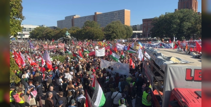 Almanya'nın başkenti Berlin, "Tüm Gözler Gazze’de" temasıyla düzenlenen ve on binlerce kişinin katıldığı büyük bir protestoya ev sahipliği yaptı. İsrail'in Gazze Şeridi'nde gerçekleştirdiği eylemlerin durdurulması talebiyle toplanan kalabalık, soykırımın son bulması için sesini yükseltti.