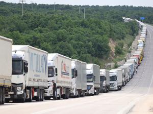 Tırlar, Bulgaristan'ın yoğunluğa cevap verememesi nedeniyle saatlerce kuyrukta bekliyor..AA