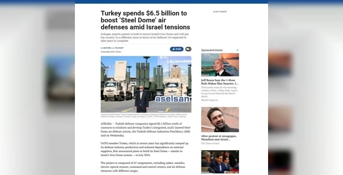 Times of Israel gazetesi aracılığıyla Çelik Kubbe anlaşmasına geniş yer veren İsrail basını, Türkiye ile İsrail arasındaki ilişkilerin Gazze'deki gelişmeler nedeniyle gerildiğini ve Cumhurbaşkanı Erdoğan'ın İsrailli yetkililer hakkında aldığı tutuklama emri gibi konulara değindi. Bölgedeki artan gerilimler eşliğinde Türkiye'nin savunma harcamalarını yükselttiği, özellikle İHA üretimi ve silah ihracatında dünya genelinde öne çıktığı vurgulandı. İHA'ların Ukrayna, Suriye, Dağlık Karabağ ve Afrika'daki çatışmalarda etkin rol oynadığı belirtildi. Savunma Sanayii Başkanı Prof. Dr. Haluk Görgün'ün, "Sözleşmelerin Türkiye’nin caydırıcılığını artıracağını ve savaş sistemlerinin menzil ile kapsamını genişletmeye katkı sağlayacağını" ifade eden sözleri de haberde yer aldı. İsrail basını, "Türkiye'nin uzun süredir savunmasını güçlendirdiği ve artık savunma sanayii ihracatında dünya sıralamasında üst sıralarda yer aldığı" değerlendirmesini yaptı.