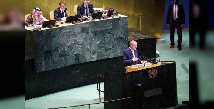 Cumhurbaşkanı, uluslararası toplumun, İsrail'in yayılmacı politikalarını durdurmak ve Filistin Devleti'nin kurulmasını desteklemek zorunda olduğunu ifade etti. Birleşmiş Milletler Güvenlik Konseyi üyelerinin Filistin Devleti'ni tanıma kararını tarihi bir adım olarak nitelendirdi. Filistin'in Birleşmiş Milletler'e tam üyeliğinin de vaktinin geldiğini vurguladı.
