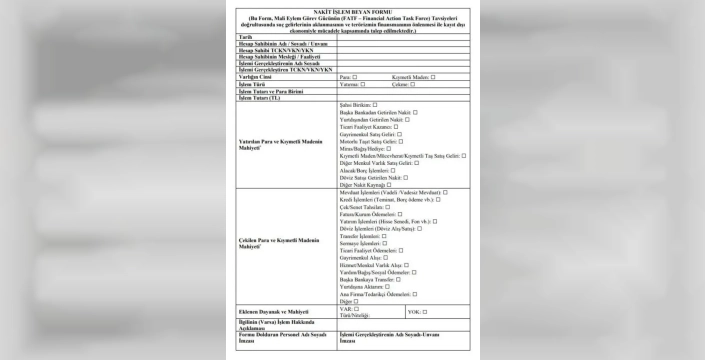 Bakanlığın tebliğinde belirtildiği üzere, bankalar ve ödeme kuruluşları işlemin mahiyetini beyan etmek için çeşitli seçenekler sunacak. Ancak bu seçenekler arasında yer almayan genel ifadeler (“diğer”, “bireysel ödeme” gibi) seçildiğinde, müşterinin en az 20 karakterlik bir işlem açıklaması yapması gerekecek. Gayrimenkul alımı, araç satışı, borç ödeme, bağış, vergi ödemeleri, sağlık harcamaları, dijital varlık işlemleri gibi belirli işlem türleri için de standart başlıklar zorunlu hale gelecek. Daha yüksek miktarlarda, yani 2 milyon TL ile 20 milyon TL arasındaki transferler için 'Nakit İşlem Beyan Formu' doldurulması gerekecek. 20 milyon TL'nin üzerindeki transferlerde ise paranın kaynağına dair ek bilgi ve belgeler talep edilecek. Müşterinin sunduğu açıklamanın onaylanmaması durumunda para transferi gerçekleştirilmeyecek. Bu kurallar, 15 Mart 2026'dan itibaren ATM'ler üzerinden yapılacak para transferlerini de kapsayacak; toplam tutarı 400 bin TL'yi aşan işlemler için açıklama zorunluluğu getirilecek.