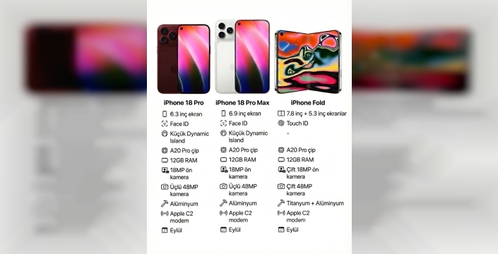 Tasarım tarafında ise kullanıcıları şaşırtacak radikal bir değişiklik göze çarpıyor. iPhone 18 Pro ve Pro Max modellerinin görsellerinde, mevcut Dynamic Island yapısının yerine ekranın sol üst köşesine konumlandırılmış bir kamera deliği tasarımı dikkat çekiyor. Metinlerde 'Küçük Dynamic Island' ifadesi yer alsa da, bu tasarım değişikliği Apple'ın ekran-gövde oranını artırmak için yeni bir yol izleyebileceğini gösteriyor. iPhone 18 Pro modelinin 6.3 inç, iPhone 18 Pro Max modelinin ise 6.9 inç ekran boyutuna sahip olacağı belirtiliyor. Kamera ve malzeme kalitesi tarafında da önemli veriler mevcut. Pro modellerinin arka tarafında üçlü 48MP kamera kurulumu yer alırken, ön tarafta 18MP selfie kamerası bulunacak. İlginç bir şekilde, Pro modellerinin gövde malzemesi olarak Alüminyum kullanılacağı bilgisi yer alıyor. Güvenlik tarafında ise bu modellerde yine Face ID teknolojisinin kullanılmaya devam edileceği görülüyor. Sızıntının en heyecan verici kısmı şüphesiz iPhone Fold. Katlanabilir modelin açıldığında 7.8 inç, kapandığında ise 5.3 inç büyüklüğünde ekranlara sahip olacağı iddia ediliyor. Pro modellerinden farklı olarak bu cihazda Face ID yerine Touch ID kullanılacağı ve malzeme yapısının Titanyum ve Alüminyum karışımından oluşacağı belirtiliyor. Ayrıca iPhone Fold'un çift 48MP arka kamera ve çift 18MP ön kamera ile geleceği söyleniyor. Tüm bu modellerin tanıtım tarihi olarak ise klasikleşmiş olan Eylül ayı işaret ediliyor. Apple'ın bu radikal tasarım değişiklikleri ve katlanabilir telefon hamlesi hakkında siz ne düşünüyorsunuz, sizce kamera deliği tasarımı Dynamic Island'dan daha iyi bir tercih mi?