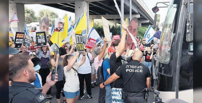 İsrail'de Başbakan Binyamin Netanyahu hükümetinin Gazze'deki ateşkes ve esir takas anlaşmasını imzalamasını isteyen binlerce kişi, dün kitlesel protestolar ve yol kapatma eylemleri düzenledi. Esir yakınları, 'ulusal mücadele günü' olarak ilan ettikleri eylemlerle birçok kentte yolları trafiğe kapattı. Protestolar, ülke çapında geniş bir alana yayıldı.