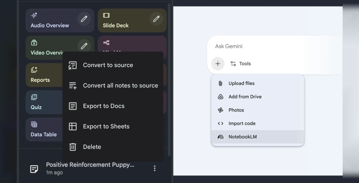 İş dünyasında toplantı notlarını görev tablolarına, akademik araştırmalarda onlarca makaledeki klinik deney sonuçlarını tek bir tabloya, sınav hazırlığında tarihi olayları düzenli çalışma tablolarına ve seyahat planlamasında farklı destinasyonların maliyetlerini karşılaştıran tablolar hazırlamaya olanak tanıyan bu özellik, şu an için Google AI Pro ve Ultra abonelerine açık olsa da önümüzdeki haftalarda tüm ücretsiz kullanıcılara da sunulacak. NotebookLM artık doğrudan Gemini uygulamasıyla da entegre çalışabiliyor. Kullanıcılar, not defterlerini web üzerinden (yakında mobilde) Gemini'a yükleyerek birden fazla not defterini birleştirip geniş kapsamlı analizler yapabilir, notlarından ilham alan özel uygulamalar veya görseller oluşturabilir, mevcut araştırmalarını internet üzerindeki güncel bilgilerle harmanlayabilirler. Oluşturulan veri tabloları tek tıkla Google E-Tablolar formatına aktarılabiliyor ve çalışma kılavuzları, özet dokümanlar veya tüm içerik doğrudan Google Dokümanlar'a gönderilebiliyor.