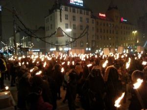 OSLO'DA PEŞAVER SALDIRISI KINANDI.TERÖR LANETLENDİ.(Nei til krig, nei til terror, nei til vold) Yüzlerce norveçli ellerinde meşalelerle Pakistanda terör saldırısı sonucu ölen çocuklar için terör protesto edildi.