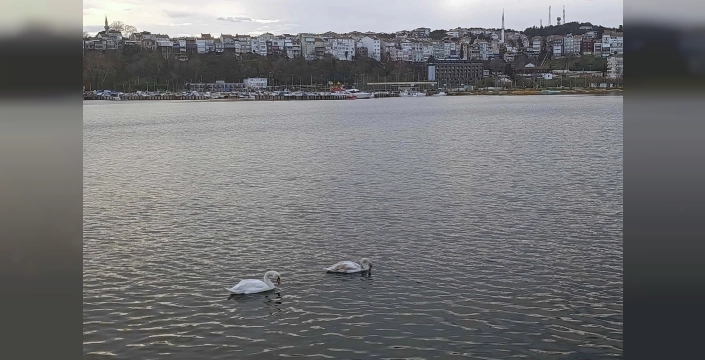 İstanbul'un Şile Limanı'na gelen iki kuğu, rüzgarsız havanın ve limandaki sakinliğin tadını çıkararak huzur içinde dolaştı.