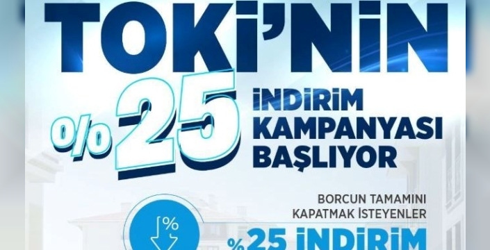 Toplu Konut İdaresi Başkanlığı (TOKİ), konut ve iş yeri borçlarını erken kapatmak isteyenler için yüzde 25 indirim kampanyası başlatıyor. Kampanya, 22 Eylül 2025 tarihinde başlayacak ve 17 Ekim 2025 tarihine kadar devam edecek.