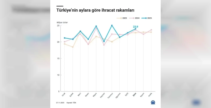 Türkiye İstatistik Kurumu (TÜİK), 2025 yılı Ekim ayına ait dış ticaret verilerini açıkladı. Ekim ayında ihracat, geçen yılın aynı dönemine göre yüzde 2 artışla 23 milyar 941 milyon dolara yükseldi. Aynı dönemde ithalat ise yüzde 7,2'lik artışla 31 milyar 521 milyon dolar olarak gerçekleşti.
