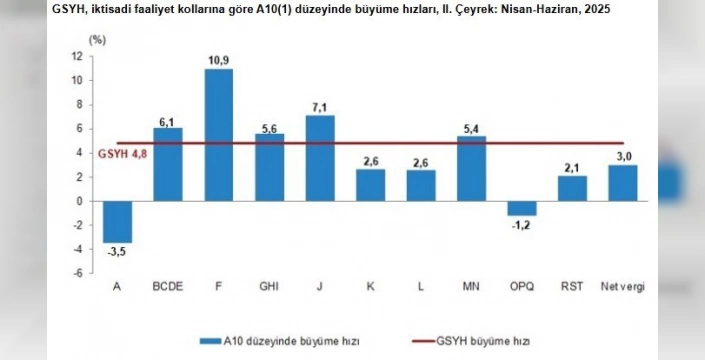 GSYH'yi oluşturan sektörlere bakıldığında; 2025 yılının ikinci çeyreğinde inşaat sektörü %10,9, bilgi ve iletişim faaliyetleri %7,1, sanayi %6,1, ticaret, ulaştırma, konaklama ve yiyecek hizmetleri %5,6, mesleki, idari ve destek hizmet faaliyetleri %5,4, ürün üzerindeki vergiler eksi sübvansiyonlar %3,0, finans ve sigorta faaliyetleri %2,6, gayrimenkul faaliyetleri %2,6 ve diğer hizmet faaliyetleri %2,1 oranında büyüdü. Tarım sektörü ise %3,5, kamu yönetimi, eğitim, insan sağlığı ve sosyal hizmet faaliyetleri ise %1,2 oranında daraldı. Mevsim ve takvim etkilerinden arındırılmış GSYH, bir önceki çeyreğe göre %1,6 artarken, takvim etkisinden arındırılmış GSYH aynı dönemde %4,6 arttı.