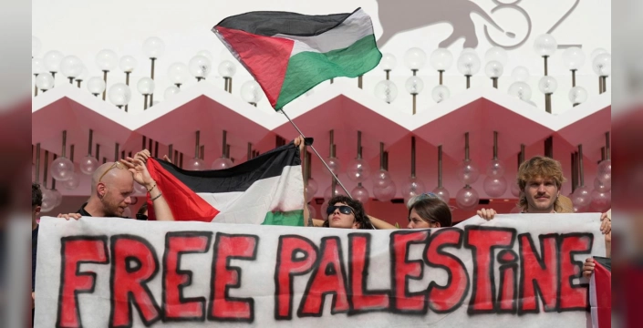 Filistin bayrakları ve 'Özgür Filistin, soykırımı durdurun' yazılı pankartlar açan göstericiler, Venedik Film Festivali'nden kamuoyuna açık bir tavır almasını ve İsrail'in Filistin'de işlediği 'soykırımı' kınamasını talep etti. Gazze'deki insani krize dikkati çekmek isteyen grup, 'Özgür Filistin' ve 'Nehirden denize özgür Filistin' sloganları attı. Filistin destekçisi grubun sözcüleri, 30 Ağustos'ta yerel saatle 17.00'de bir protesto gösterisi düzenlemeyi planladıklarını basına açıkladı.